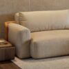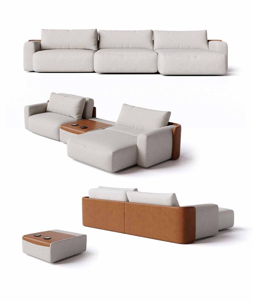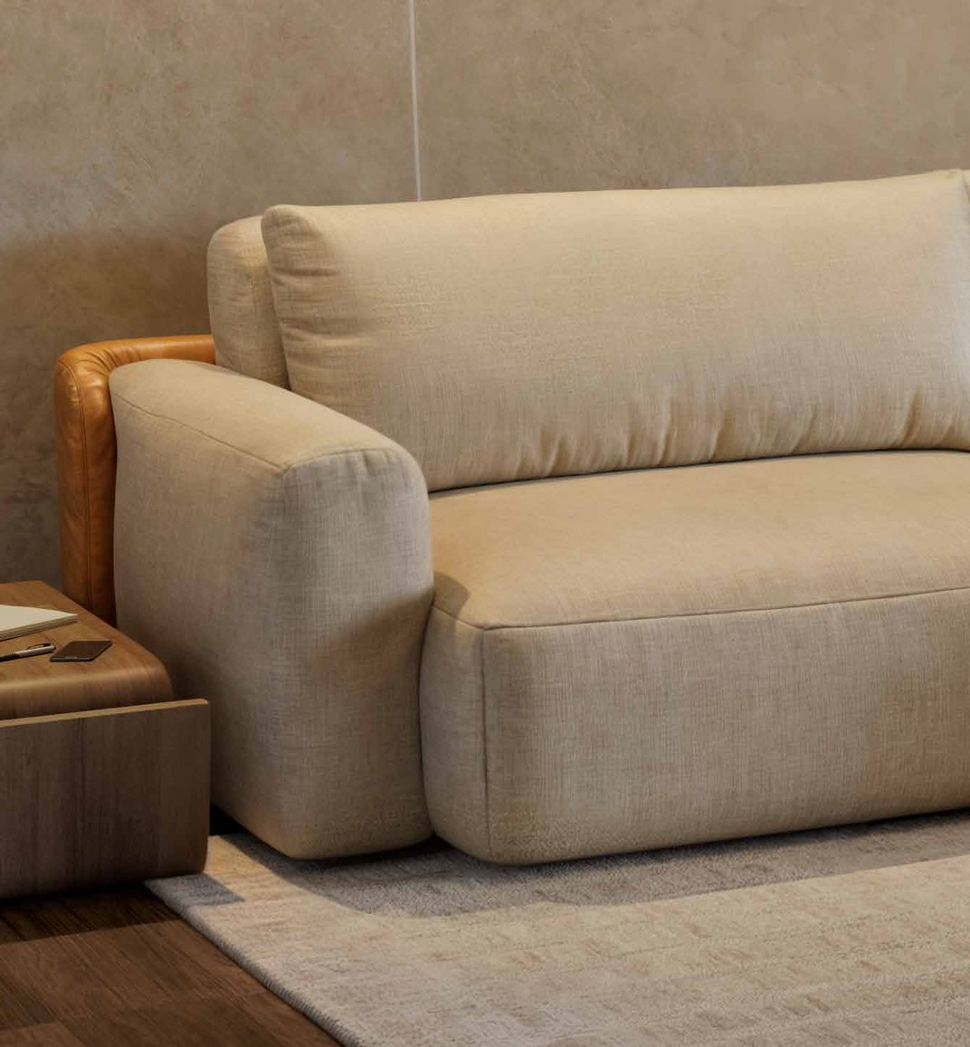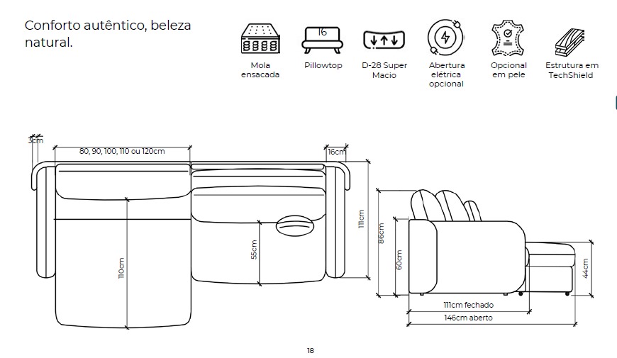 O encosto é reclinável e acompanha almofadas soltas em fibra siliconizada, com almofadas decorativas inclusas para um apoio mais macio e uma acomodação ainda mais agradável. Como diferenciais, o modelo conta com pillow top de 16 cm, base com caixa compacta revestida em corino e pés em madeira, resultando em estabilidade e um acabamento bem resolvido.